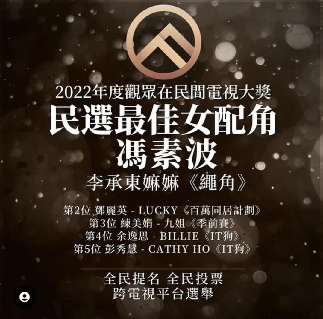 馮素波今日在社交網分享多張拍攝《繩角》時的花絮照,當中見有楊樂文(Lokman)、江𤒹生(AK)、王智德(Alton)及邱傲然(Tiger),她感恩自己遇上好劇本,並表示︰「【嫲嫲繼續努力】好多謝《觀眾在民間電視大獎》,在新年伊始收獲我演藝生涯的第一個獎項。好感恩《繩角》這部作品,遇到好好的劇本,優秀的製作團隊,是你們選擇了我。更感恩是有機會與戲中幾位年青人真情互動,讓『嫲嫲』再被大家認識。好多謝各位觀眾,各位網友,各位鍾意我的朋友。多謝乖孫,多謝乖孫新抱,多謝你們成班兄弟。」AK即留言「恭喜嫲嫲」,而馮素波則回覆︰「多謝孫新抱仔。」