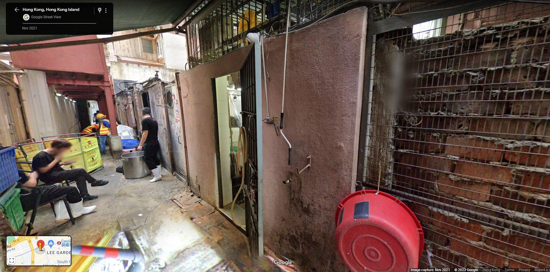 本報記者翻查資料,Google Map於2021年11月所存檔的街道圖,顯示相關食肆的天井位置,未有任何構築物,惟記者日前到相關後巷視察,該位置則搭有大型天花板。而相關食肆另一個約100平方呎的天井位置,疑同樣違法搭建鐵皮作天花板頂,闢作廚房之用。當中,有沒有佩戴口罩的職員,以流動餐桌作切肉枱,處理生肉;其身後更有大膠籃及廚具等用品,部分掛在生銹水管的牆上,部分則散落一地,衛生情況有欠理想。記者以食客身份向落單的女店員查詢餐廳「擴建」的原因,該名女店員壓低聲線表示:「依家多咗內地客返嚟嘛,老細想做多啲生意,咪開多咗個位入客囉。」