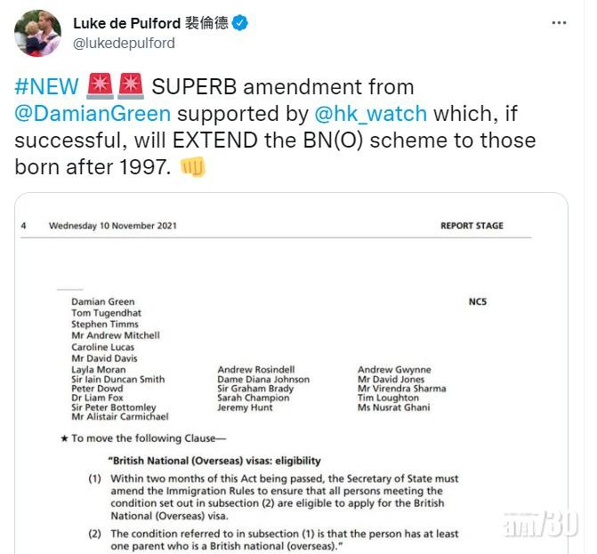《港區國安法》實施後,英國放寬BNO入籍途徑,當中BNO簽證再有新發展。英國國會正審議《國籍與邊界法案》,有下議院議員提出修正建議,提倡放寬BNO簽證的申請資格,讓父母其中一方有BNO的人士亦合資格申請。聲稱關注香港情況的英國保守黨人權委員會委員裴倫德(Luke de Pulford)早前於社交網站Twitter發文,表示若修訂獲得通過,意味著BNO簽證計劃將擴展至於1997年後出生的人。