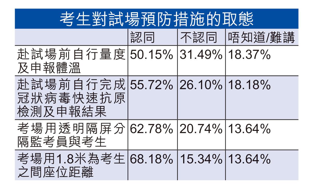 至於試場防疫措施,55%贊同赴試場前要自行作快速檢測及申報結果,約26%則不認同。對考評局早前公布,將經中學向考生發放快速抗原檢測包,按考生的考試日數發放相應數目,若一名應考4個核心科及2科選修科考生,將獲9套快測包,當中6套用於核心科及兩套用於選修科,另有一套後備。副主席鄧咏堯建議評局保留彈性,容許考生使用其他認可品牌的測試劑作複檢,確保不會出現「假陽性」無法赴考,並建議政府設置隔離試場,讓檢測呈陽性或確診的考生繼續應考,保障他們的考試權。