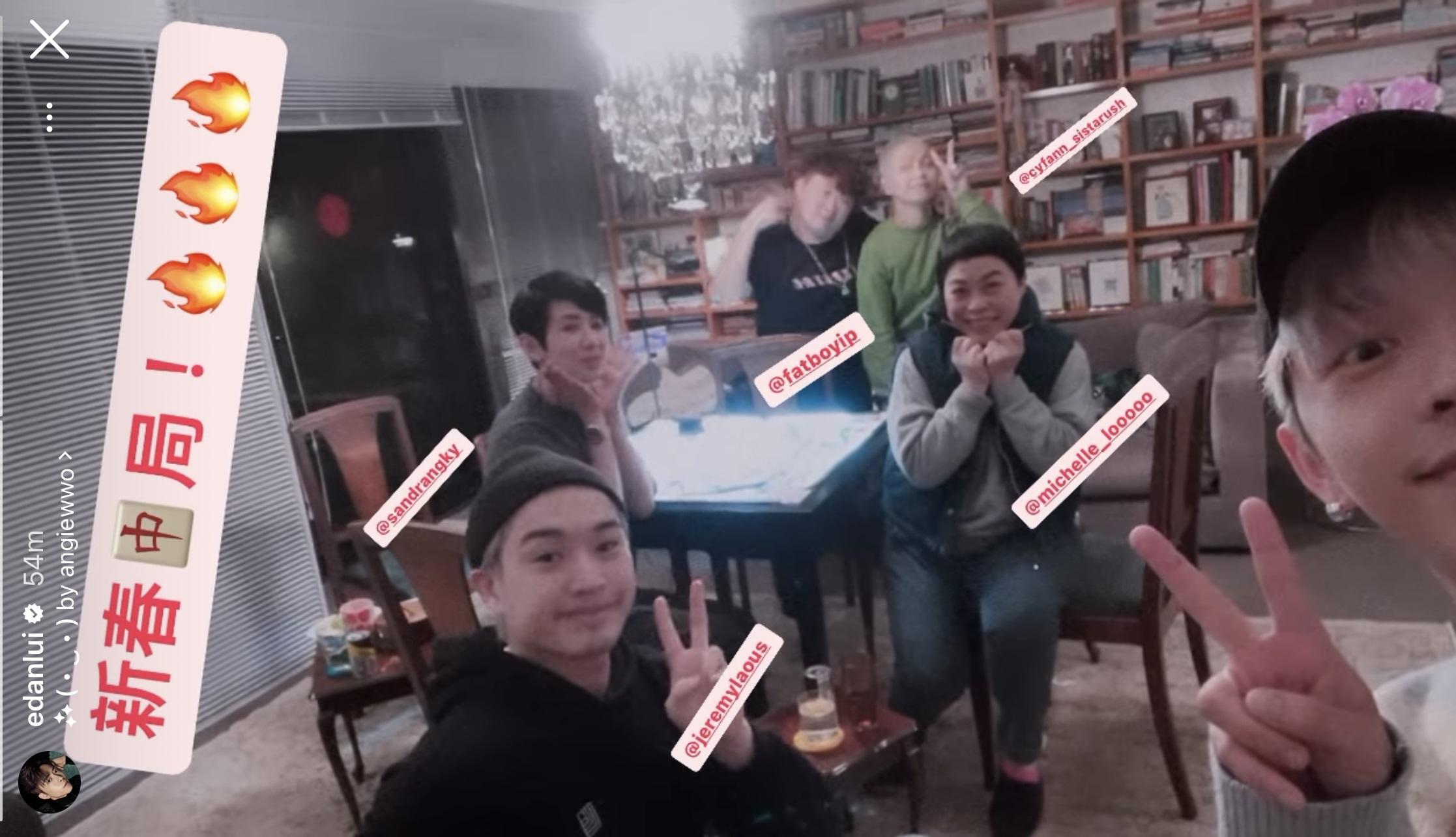 MIRROR成員呂爵安(Edan)於農曆年期間往巴黎出席時裝騷兼旅行,回港後四出拜年,並分享時裝騷的花絮。Edan繼與Anson Lo(盧瀚霆)和Jeremy(李駿傑),向汪明荃及羅家英拜年後,昨日(1日)凌晨更新社交平台的限時動態,他約了隊友Jer(柳應廷)以及ERROR成員梁業(肥仔),跟吳君如及盧覓雪開枱打麻雀。