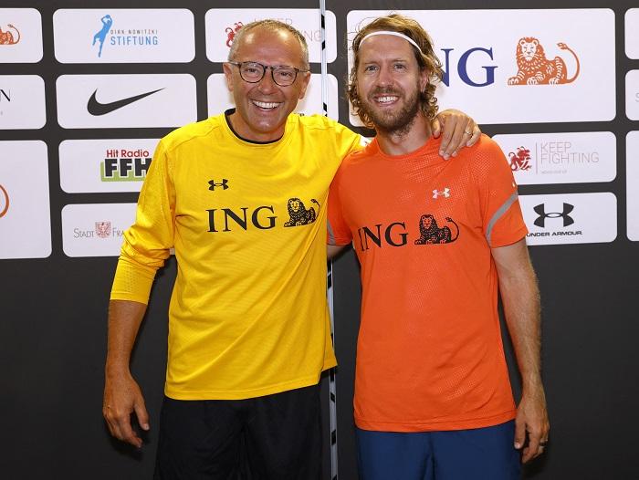 F1的主席Stefano Domenicali與維迪爾出席支援車神米高舒麥加的表演足球賽。(路透社)