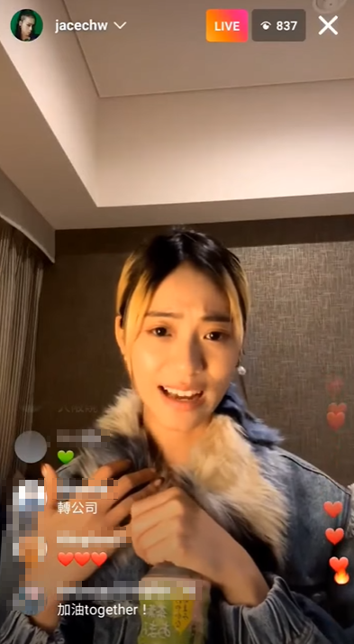 Jace在直播中表示,自己第一次去日本,因時間緊湊未有做好資料搜集,於是不停問網民有甚麼必玩必吃。心情頗好的她有問必答,又不停玩filter,期間顧定軒和梁祖堯在直播中留言,Jace亦趁機分享做舞台劇的感受。雖然在直播中她未有提到與環球目前的情況,但見到有fans留言表示擔心她,並為她打氣,Jace謂︰「好多謝你哋,我會好好加油,我要叻,我要做好自己!」