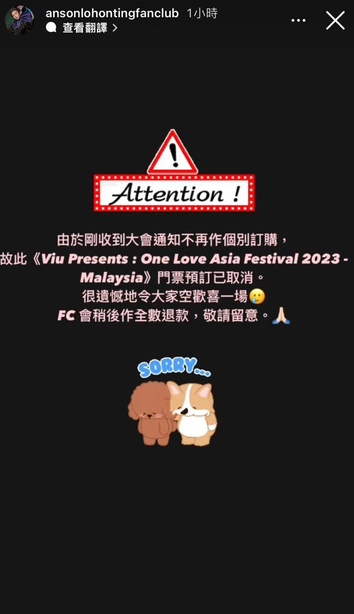 今日傍晚時份,Anson Lo的歌迷會在IG限時動態稱可代訂今次音樂節的門票,而每張門票需收取主辦單位手續費為RM4 (約港幣7元),內文更提到只供現有會員訂購,而報名截至日期為今晚9時正。不過,歌迷會在晚上8時左右,再出PO稱「剛收到大會通知不再作個別訂購」,故此取消音樂會門票預訂,並會陸續安排退款。然而, 相關內容則未見在其餘有份參與演出成員的歌迷會專頁內。