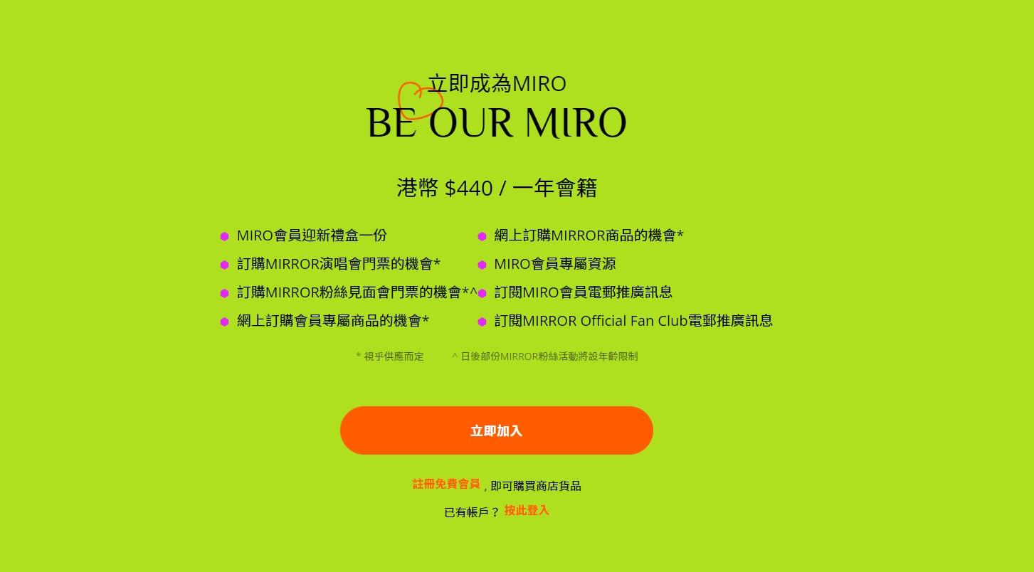 據官方歌迷會「MIRO」網站顯示,會費為$440一年,成功入會的MIRO可獲迎新禮盒,包括會員證、專屬會徽襟章、精美立體拼圖擺設、一套12張珍藏版明信片和紀念海報,以及獲機會訂購MIRROR演唱會門票、MIRROR粉絲見面會門票和網上訂購會員專屬商品。