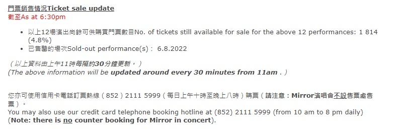 MIRROR演唱會今日10時開賣,合共12場演出約有37,700張門票,透過城市售票網公開發售,截止晚上6時半,仍有1,814張門票可供出售,而8月6日所有門票已經售罄。以每人限購兩張去推算,系統平均每小時可以完成4,000張門票交易,每分鐘可以處理約67張門票。