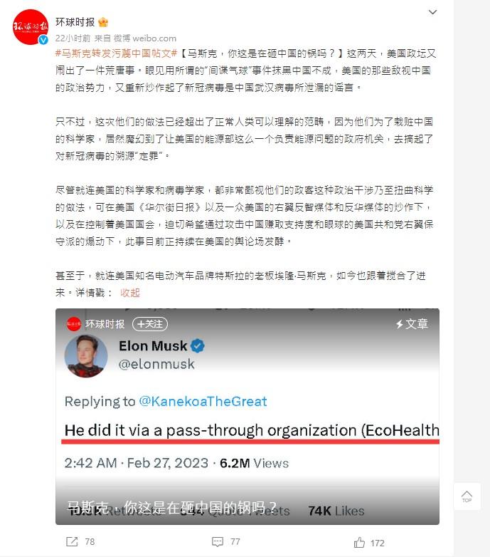 《環球時報》指,近日美國政壇眼見用所謂的「間諜氣球」事件抹黑中國,美國敵視中國的政治勢力,又重新炒作起了新冠病毒是中國武漢病毒所洩漏的謠言,又表示「連美國知名電動汽車品牌特斯拉的老闆埃隆·馬斯克,如今也跟著攪合了進來」。