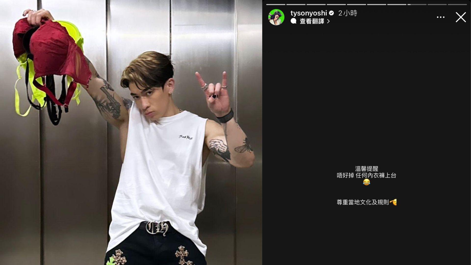 Tyson Yoshi的亞巡在3月30日假台北揭開序幕,尾站則定在5月21日於泰國舉行。Tyson Yoshi近年操出爆肌身材,胸肌更相當有睇頭,由去年的九展個唱,到今年的台灣騷,他每次站台幾乎也收到台下歌迷送上胸圍。Tyson Yoshi的大馬演唱會於明晚8時舉行,今日他抵達除了在吉隆坡機場自拍外,更出Story呼籲大家:「溫馨提示,唔好掉任何內衣褲上台,尊重當地文化及規則。」