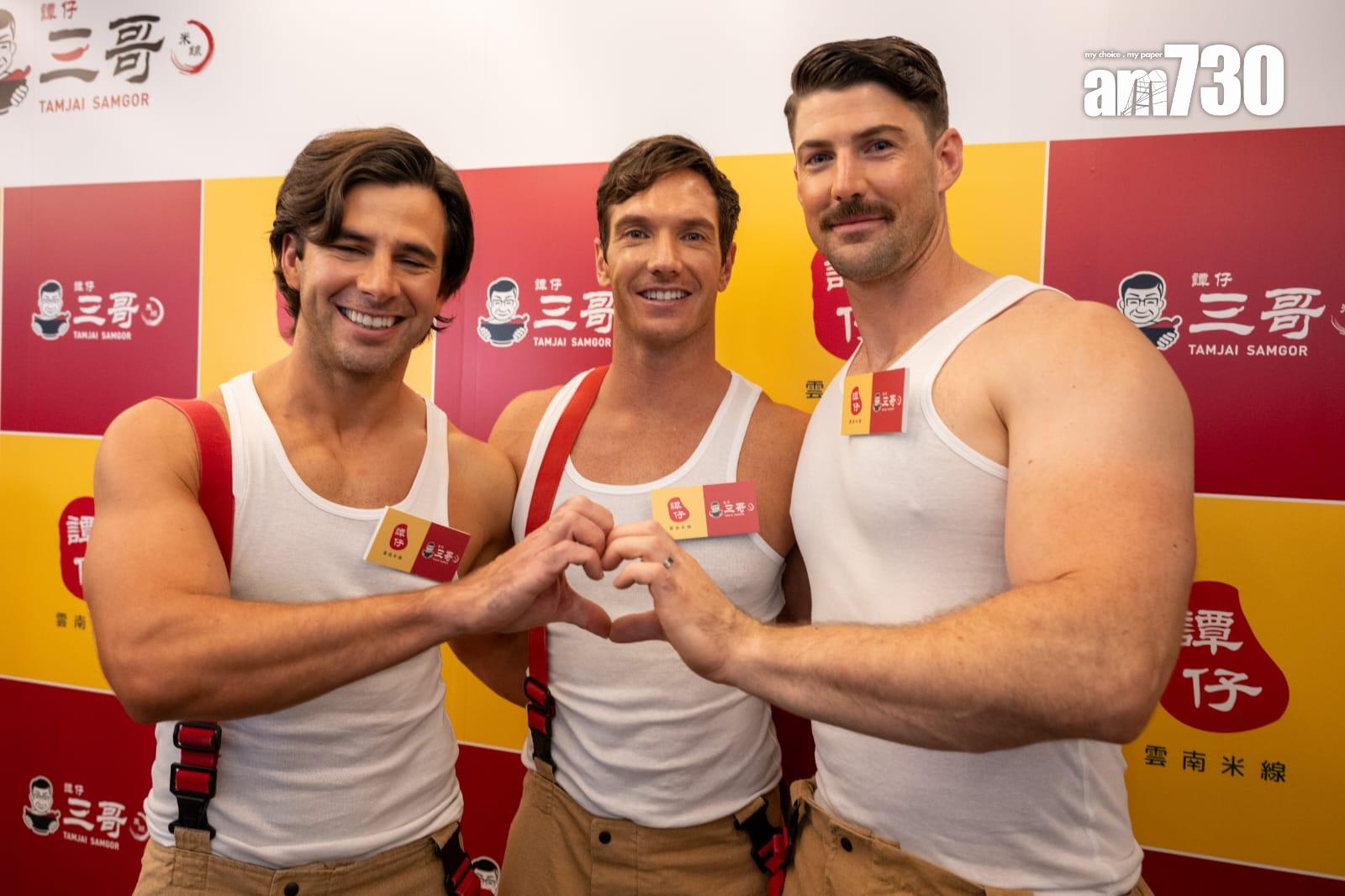 三位Hot爆的2024澳洲消防員月曆封面猛男Brenden Purvis、Michael Galanos及Ricky Smith,日抵港正式展開三天行程,今日與頭楊詩敏及練美娟一同出席譚仔雲南米線及譚仔三哥米線全新「熱鍋」系列發布會。