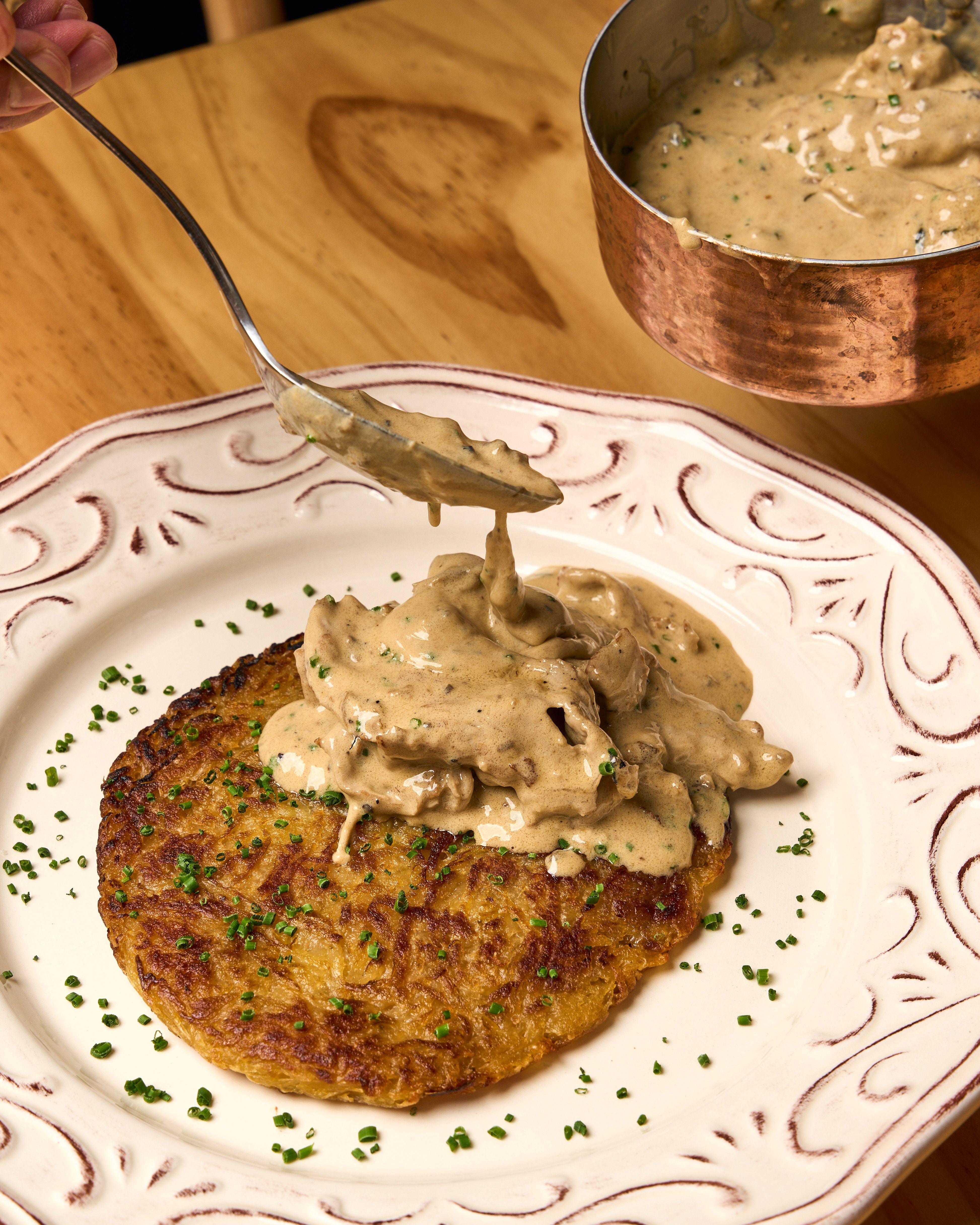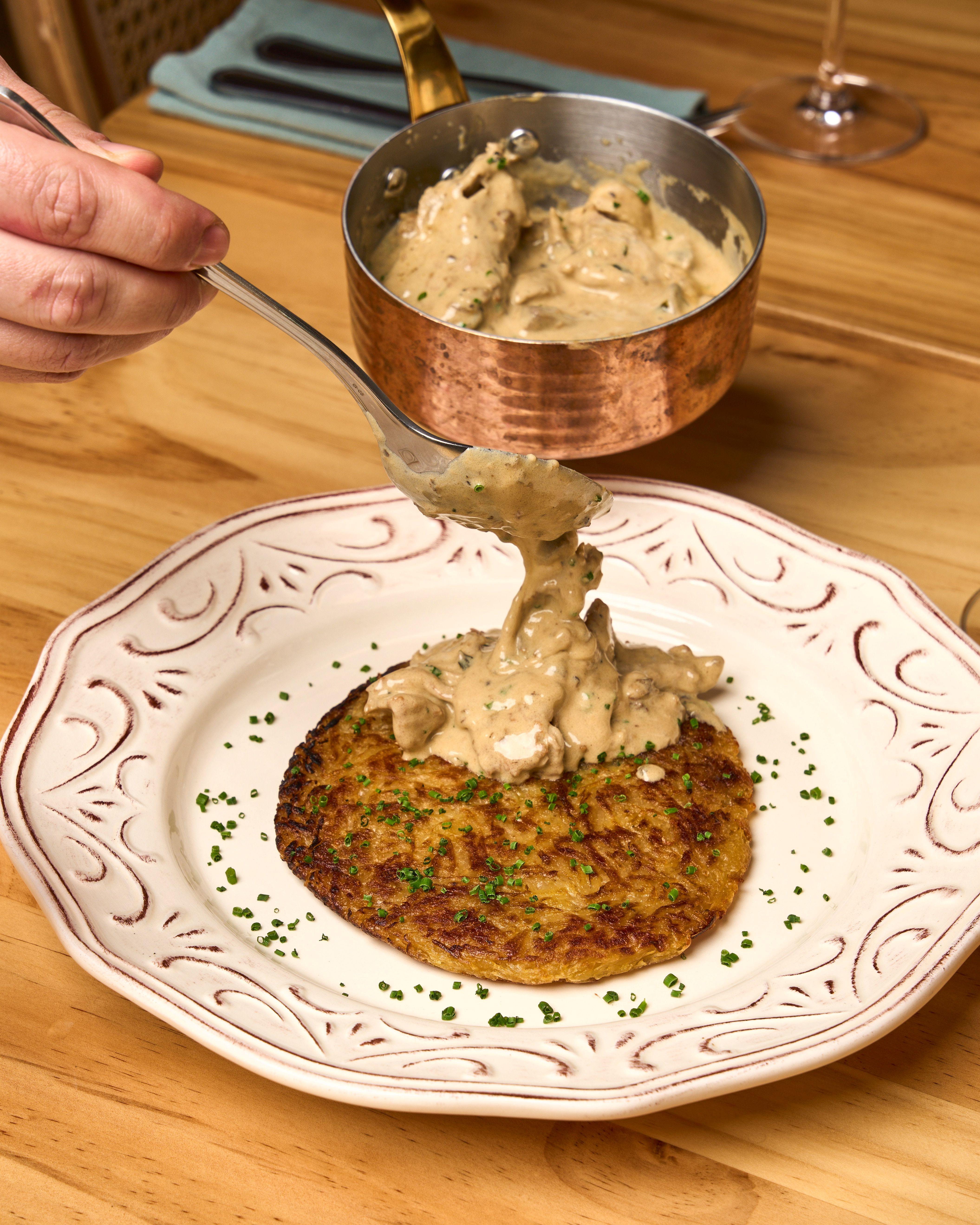 記者心水是燉小牛肉配蘑菇醬及薯餅($368),是一道結合瑞士及意大利菜的經典菜式,選用乳飼小牛肉以米蘭式烹調做法,裹上麵包糠與帕爾馬芝士後煎炸,最後以濃郁的意大利野生蘑菇醬慢燉小牛肉,濃厚滋味吃起來非常滿足!最後甜品方面必試經典甜點Tiramisu($88),以馬斯卡彭芝士(Mascarpone)、浸透濃縮咖啡的手指餅乾和可可粉精心製作,搭配餐廳獨有的兔子形狀餅乾裝飾,充滿阿爾卑斯情調。