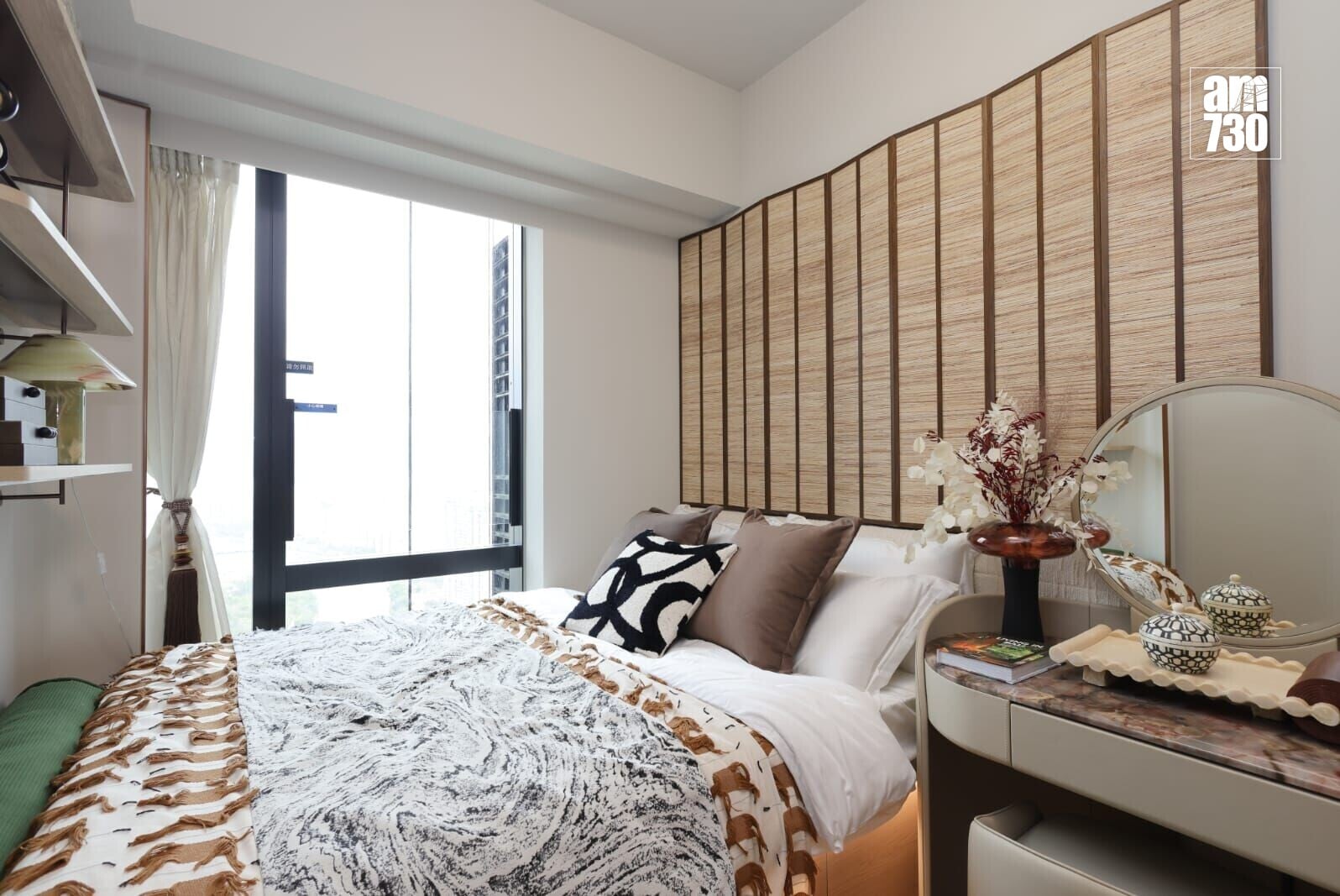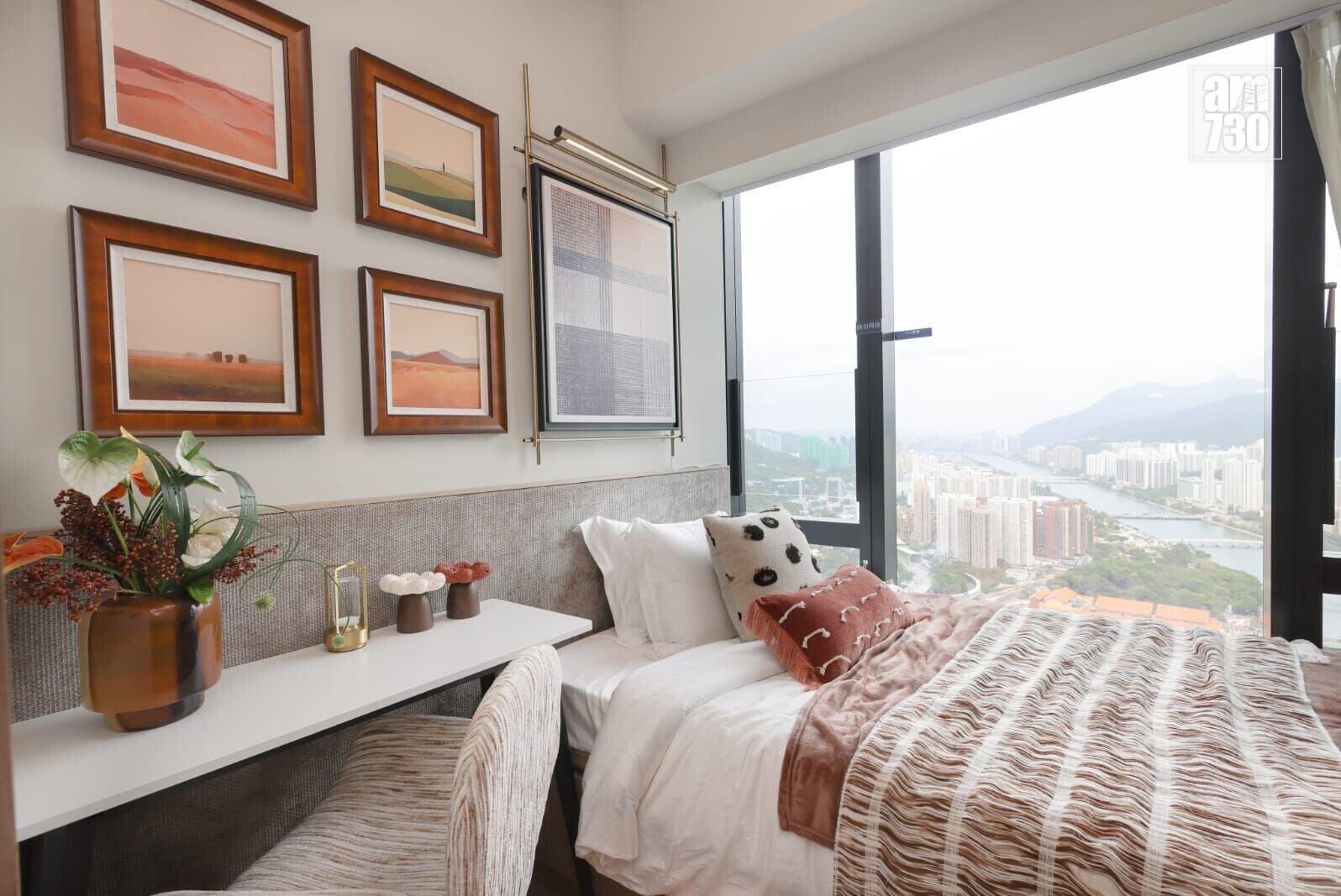 「紫蘇」是一種層次豐富、氣味細膩的香草,常見於高端餐飲之中。單位巧妙將「紫蘇」意象融入室內設計,運用流暢曲 線和溫暖柔和的色調貫穿全屋,帶出層次分明且高雅氛圍,並呼應客飯廳正對的城門河景,營造出「在城市裡度假」的悠然節奏。我們希望透過這些匠心獨運的設計,讓住戶在繁忙的都市生活中,也能感受到自然與藝術的融合,在自然流暢的生活氛圍中,享受身心放鬆的居住體驗。