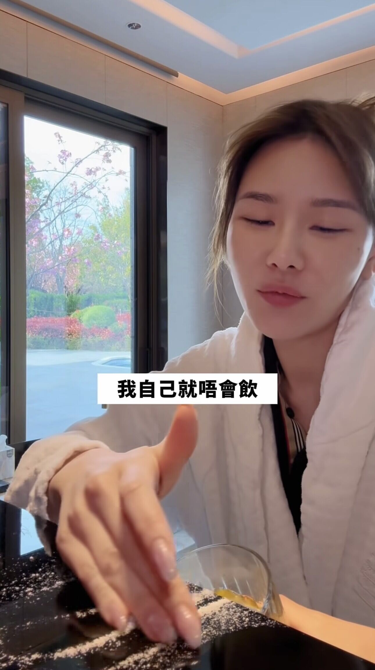影片開首,見五索拆開一包橙汁粉,卻失手將粉末打翻在枱面,她邊用手將粉末撥回杯中,邊對鏡頭笑言:「因為我唔想浪費嘅關係,所以我決定將呢啲粉沖俾馬先生飲。其實酒店日日都有打掃,所以我覺得OK囉,我自己就唔會飲,因為我身體比較虛弱。」五索行為認真「慳家」。