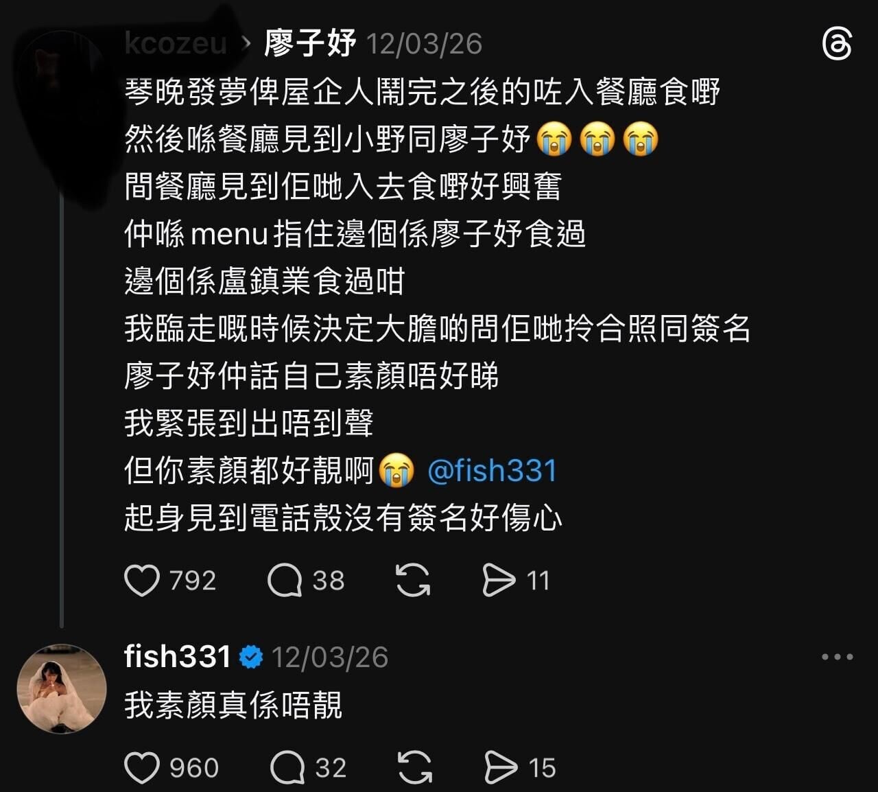 廖子妤(Fish)從寂寂無聞到今年憑《像我這樣的愛情》獲提名金像影后,隨著知名度增加,言行都備受關注。剛36歲的Fish自言不能像小孩般率性行事,包括睇Threads有感「關你叉事」,難忍手回應網民。從初入行純粹喜歡演戲和探索世界,如今成為電影圈一分子,她希望能帶來改變,「向世界呈現或帶來不同的新思考,或給觀眾一些娛樂,可以做得更多。」