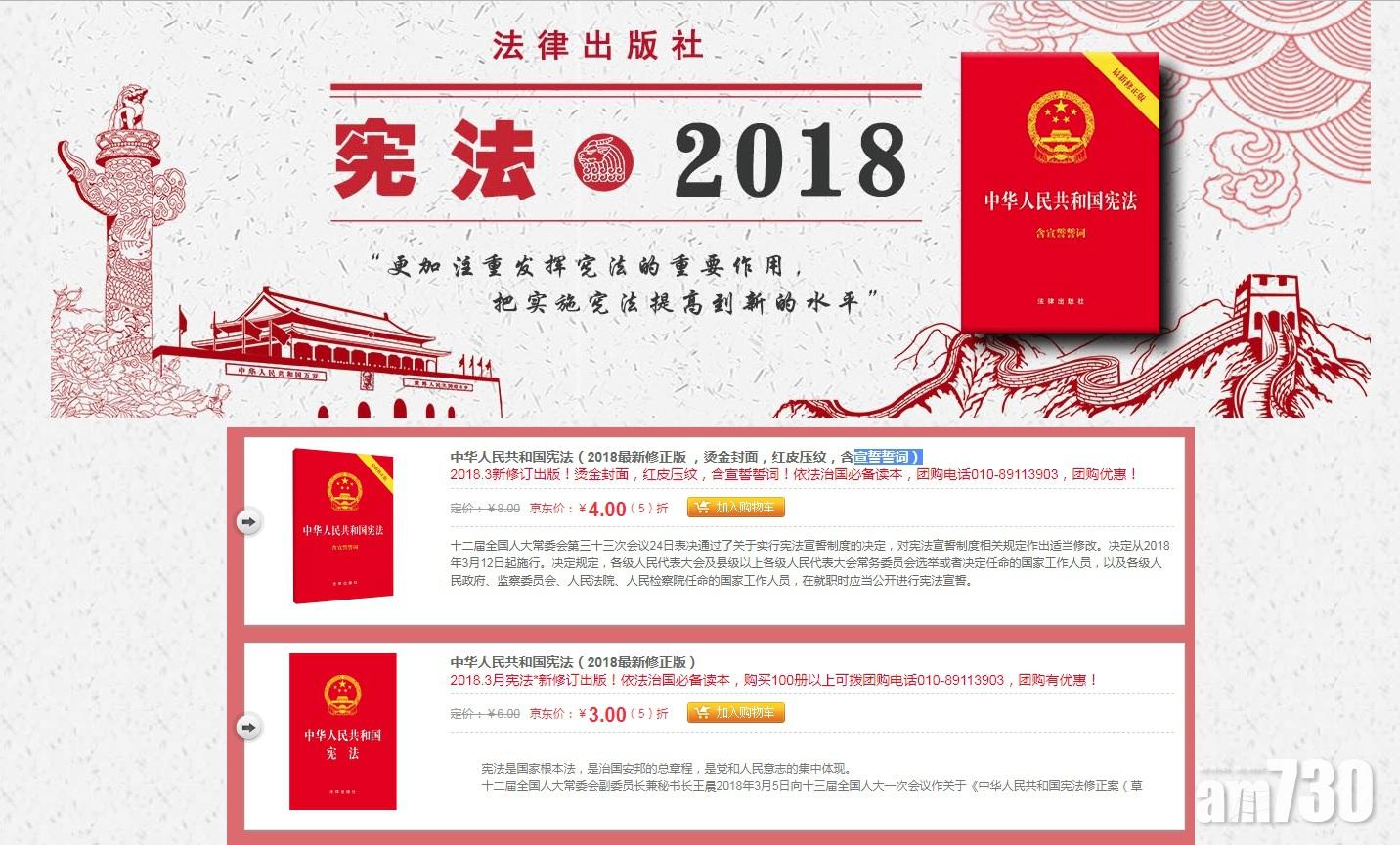 返回 本地 出版:2018-Mar-12 18:05 更新:2018-Mar-12 18:05 【效率】表決通過翌日 新版憲法上市 分享: (中新社) (中新社) 全國人大昨日表決通過憲法修正案後,由法律出版社出版的最新修正版《中華人民共和國憲法》,今日已於北京王府井書店有售。法律出版社亦在網購平台京東商城出售含宣誓誓詞及不含誓詞版本的最新版本憲法,每本分別售人民幣8元及6元,目前全部半價,團購再有優惠。 ADVERTISEMENT送健之堂舒壓好眠足湯 x 石墨烯足浴袋