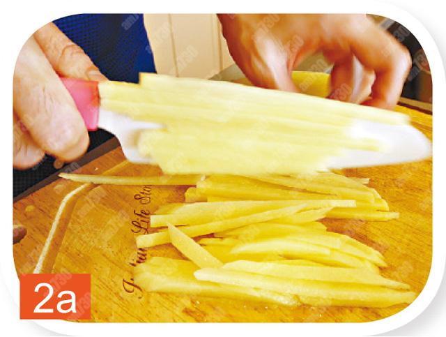 2.薯仔去皮、洗淨、瀝乾、切絲,用水沖1分鐘後,瀝乾。