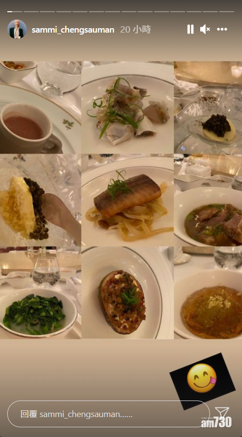 Sammi分享合照,見到杜琪峯跟古天樂都面紅紅,相信他們在飯局飲了不少,Sammi更與杜琪峯老婆黃寶玲頭貼頭合照,又分享了當晚飯局上的菜式,她留言打上hashtag稱這是「小小聚會」、「大家傾到唔捨得走」並多謝杜琪峯夫婦的安排。