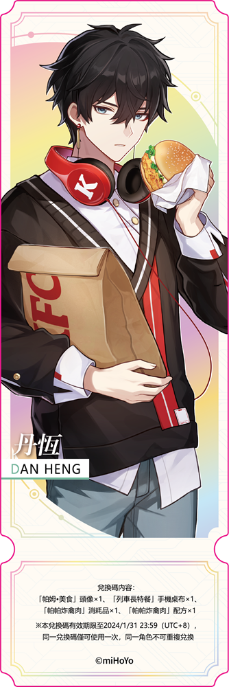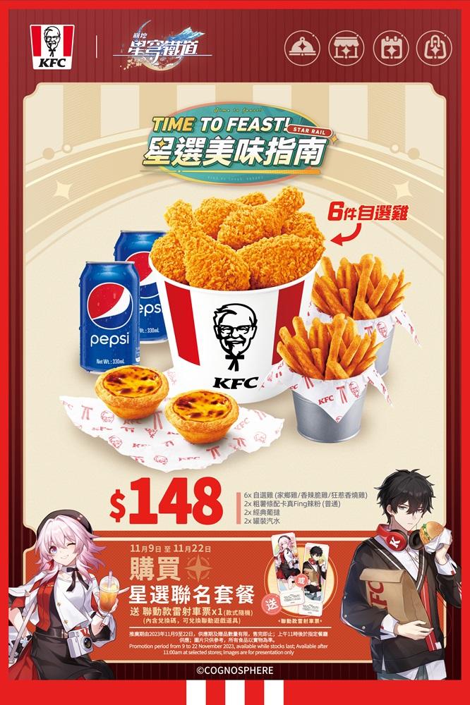 KFC與由NIJIGEN代理、HoYoverse開發的多平台銀河冒險角色扮演遊戲為主題,聯名推出《崩壞:星穹鐵道》星選聯名套餐。凡惠顧堂食或外賣自取《崩壞:星穹鐵道》星選聯名套餐一份,即送聯動款雷射車票乙張(兩款款式隨機派發,內含遊戲道具兌換碼)。