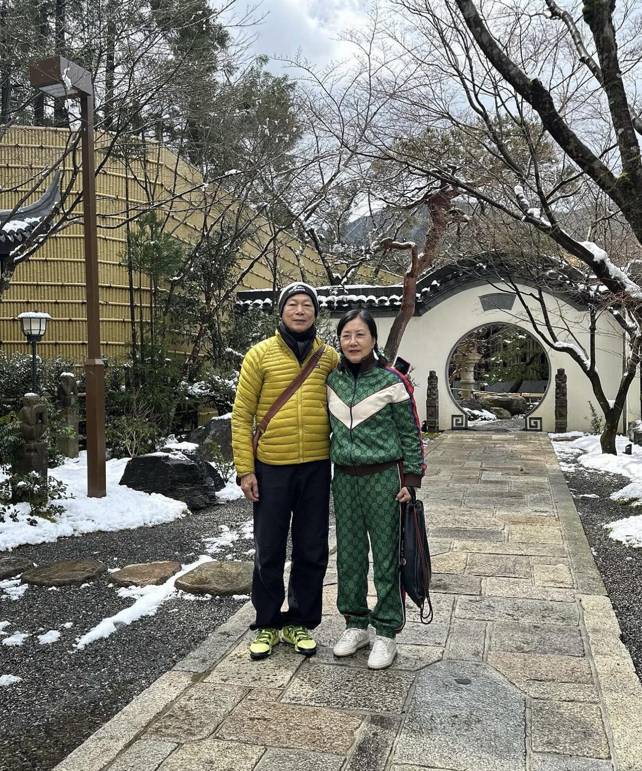汪明荃孖家英哥櫻花樹下恩愛打卡 。