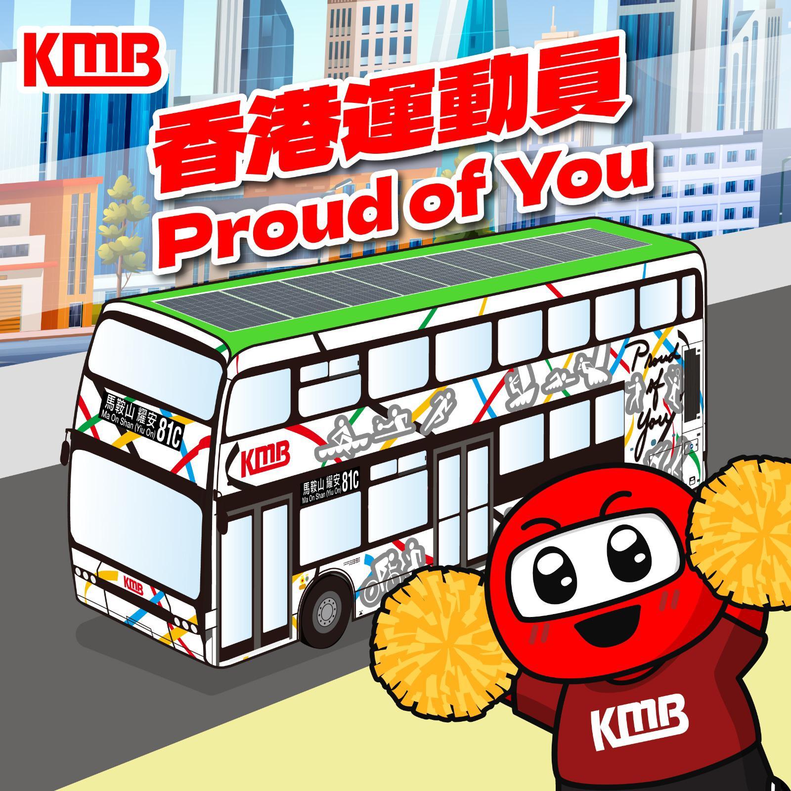 由九巴設計、以「支持港隊」為主題的巴士,車身以白色為主調,並配以五環色彩的彩帶為背影,襯托出不同運動項目的剪影,包括港隊出戰的劍擊、羽毛球、游泳等,並親筆寫上「Proud of You(以你為榮)」的字句,感謝一眾運動員在奧運各項比賽精彩的表現,為港爭光。