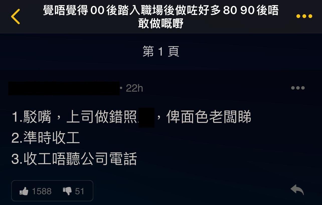 發文者先拋磚引玉,表示00後在職場會「駁嘴,上司做錯照X,俾面色老闆睇」,又會「準時收工」兼「收工唔聽公司電話」。對發文者來說,以往80、90後的打工仔未必敢做以上行為。亦有網民認同表示「主管罵緊某個team,個00後見到個鐘夠17:00,即刻返位pack嘢走人,Team其他人望住佢走」、「見過00後同同事吵完自己提早2個鐘走左」。