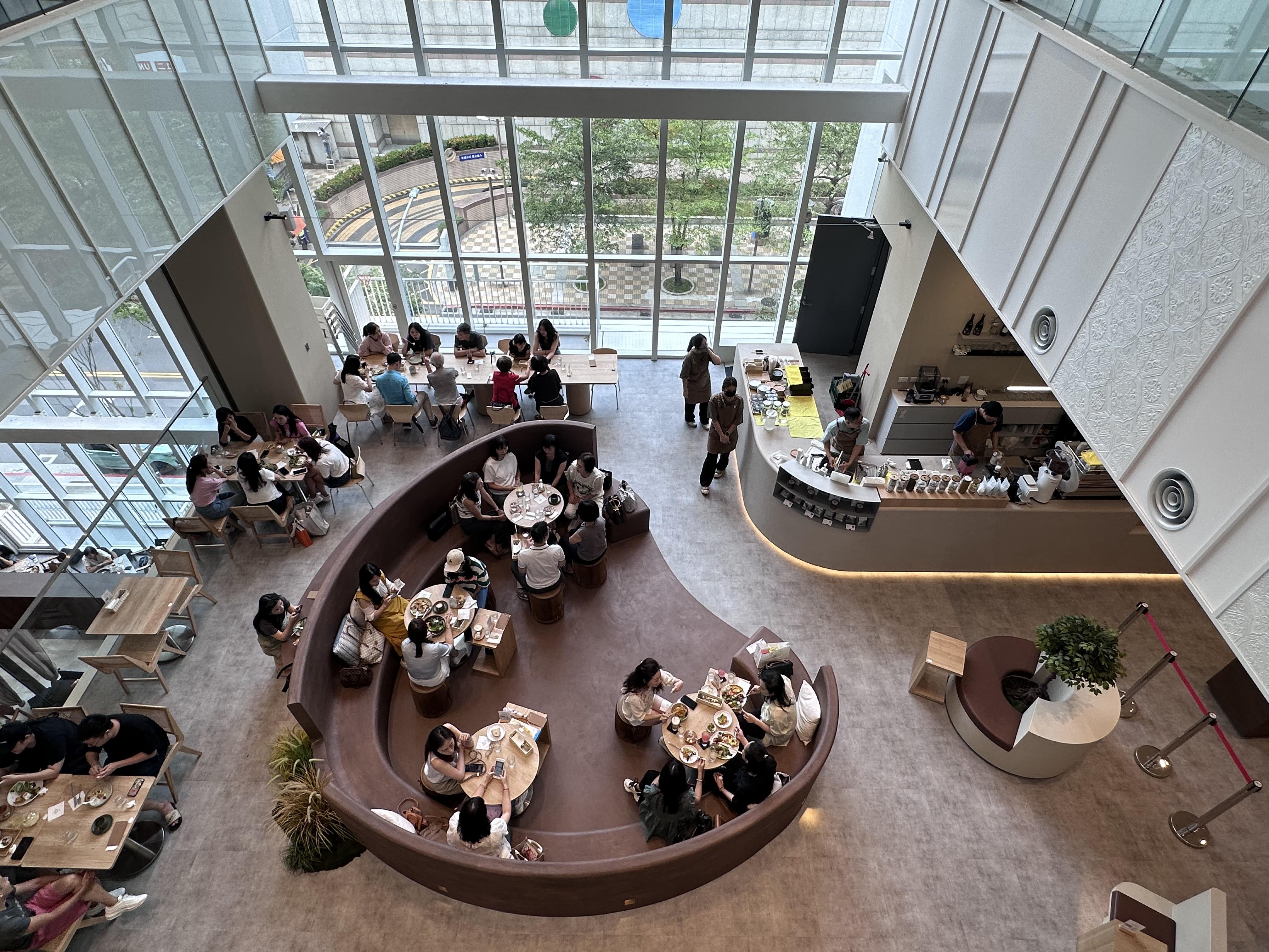 商場以輕奢路線為定位,網羅大量設計小店與Cafe,3樓空庭就可以找到被譽為台北東區最美咖啡廳「勺日Zhuori」。挑高10米、貫穿兩層樓的落地玻璃窗,光影灑落景致優美,空間舒適,最受台北貴婦歡迎,下午茶時段一位難求。