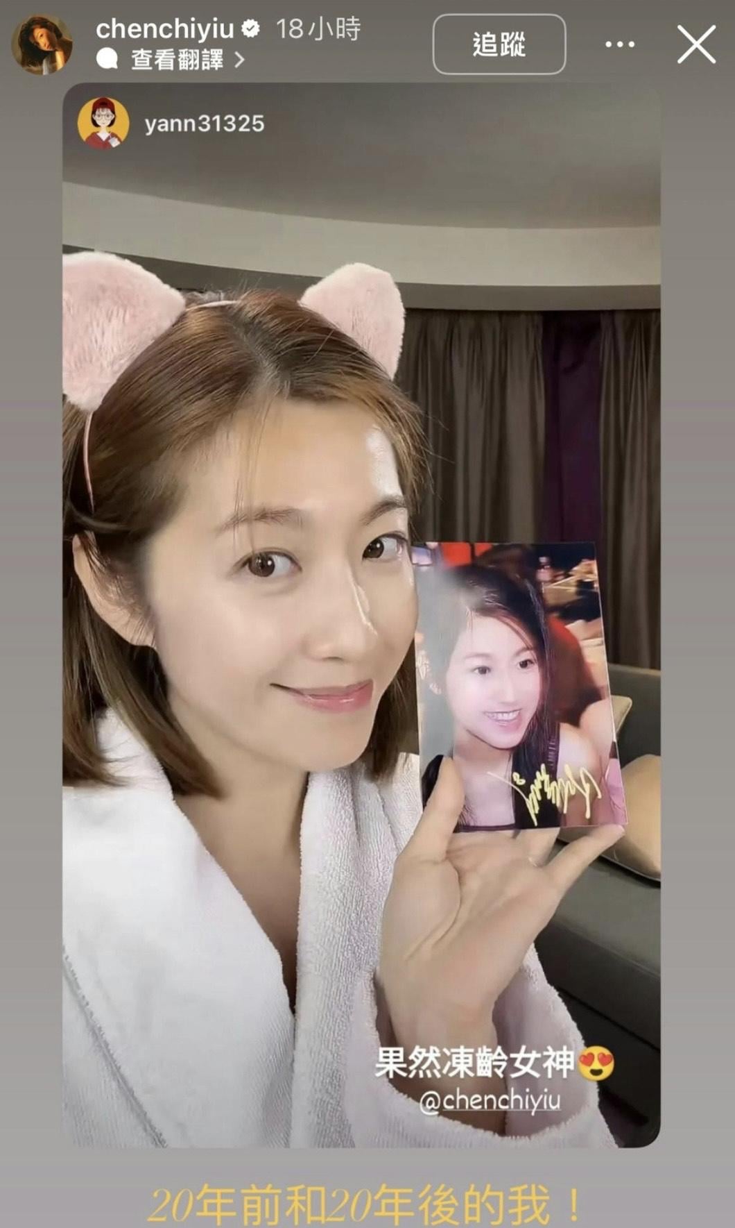 昨日陳自瑤在IG限時動態轉發粉絲貼的照片,相中見她以素顏上陣,身穿浴袍,戴上可愛的髮箍,展露甜美笑容,手中更拿着一張少女時期的靚相,陳自瑤表示:「20年前和20年後的我。」而該粉絲亦寫道:「果然是凍齡女神,現在vs那年不能說一模一樣,只能說完全一樣,Yoyo她做到了滿40減20」。相中見20年前後的陳自瑤確實分別不大,皮膚白滑零皺紋,網民都紛紛留言追問「凍齡術」。