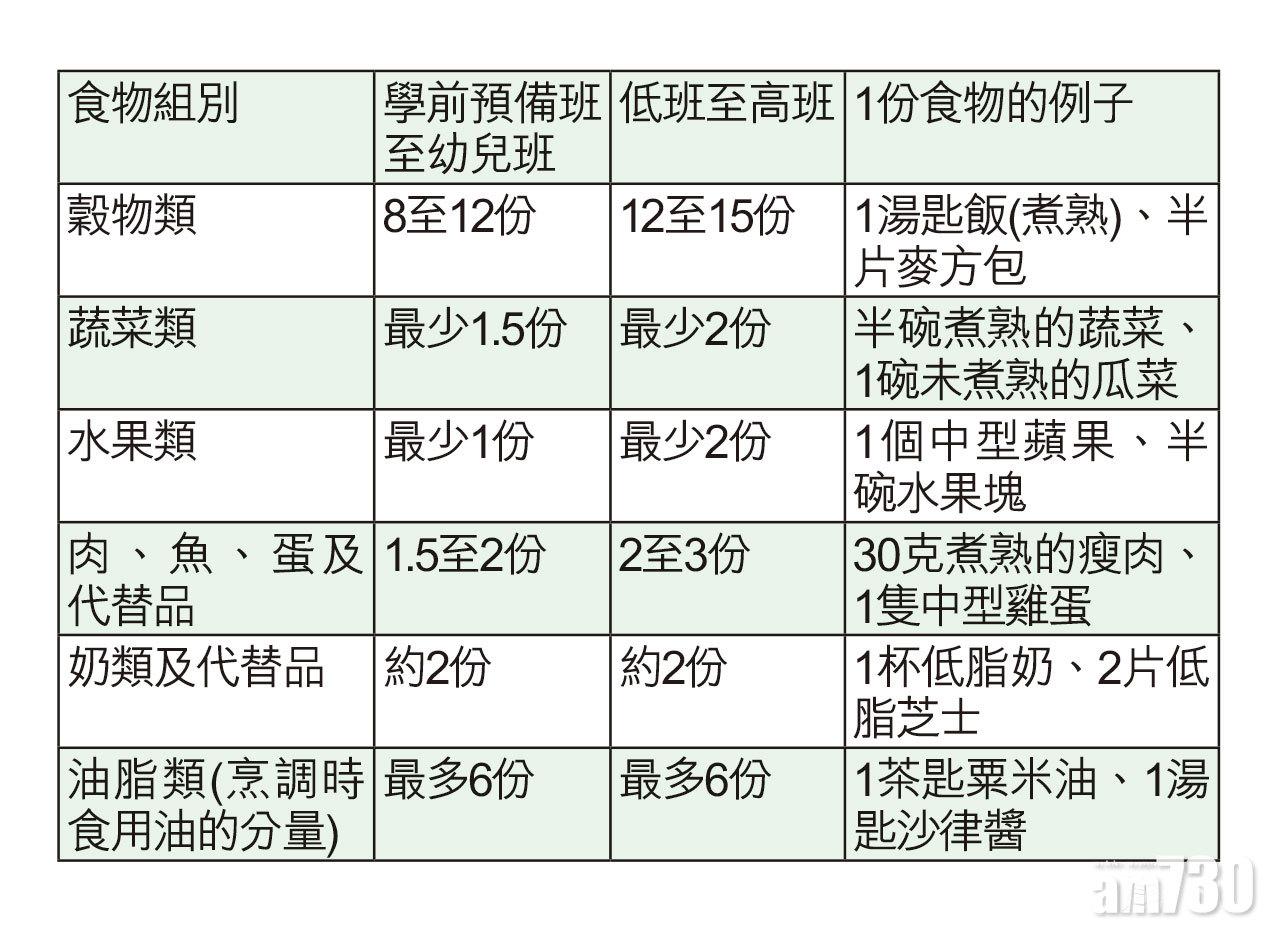 按照「健康飲食金字塔」的建議,每天為幼兒提供多元化的食物,至於各食物組別中所需的「份」量請見右表。