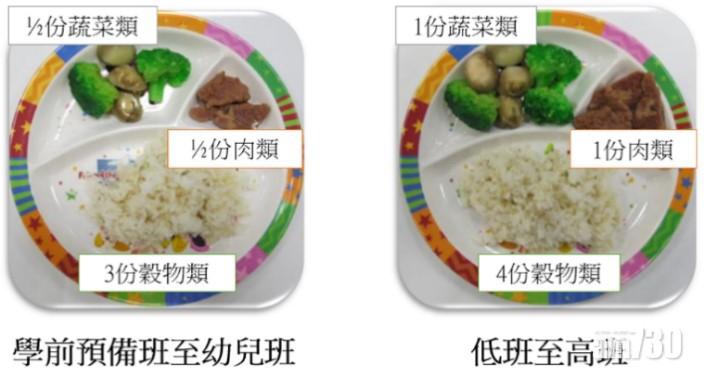 正餐應包含三大食物組別:穀物類、蔬菜類、肉、魚、蛋及代替品,而它們佔餐碟容量的比例是3:2:1。