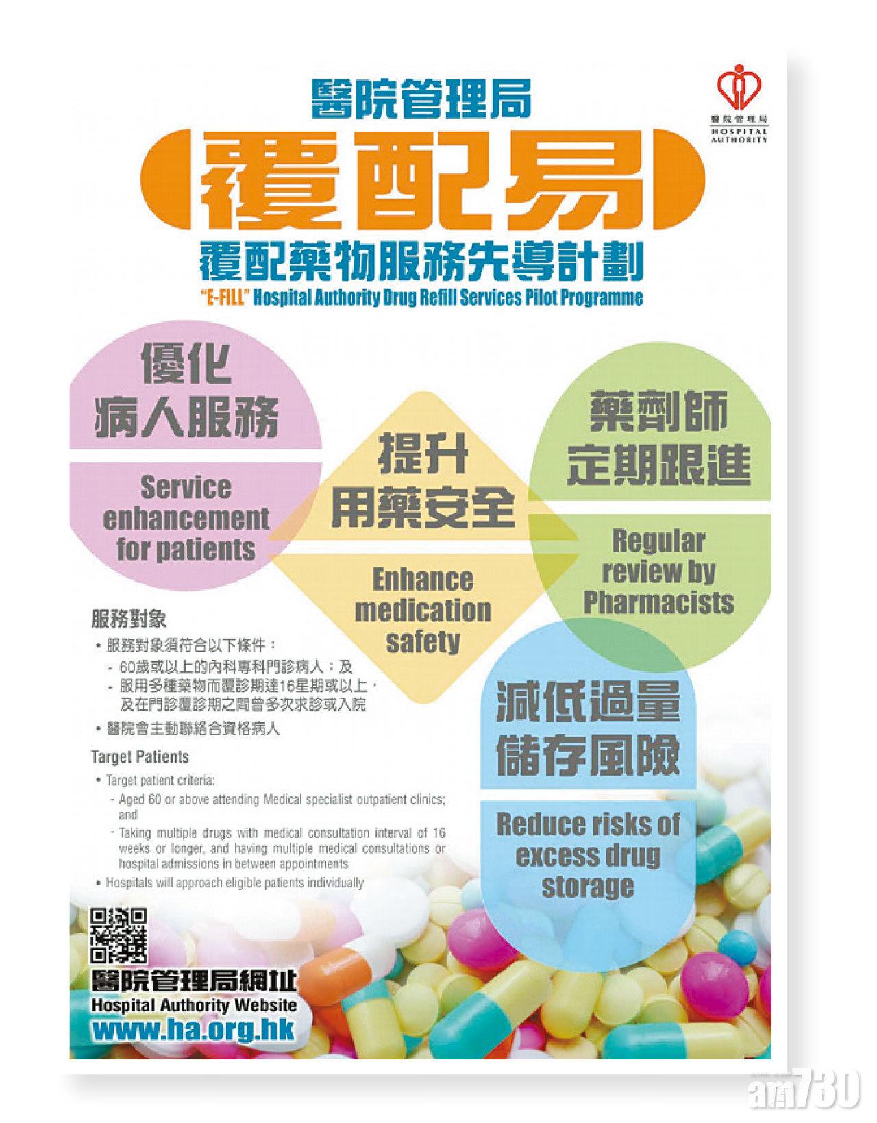 醫管局於2017年底推出「覆配易」覆配藥物服務先導計劃,先後為威爾斯親王醫院和屯門醫院的合適病人提供有關服務。醫院會將病人的藥物分成較少和容易處理的數量,藥劑師在病人覆配藥物前重新檢視和確定病人的最新情況,以確保病人安全用藥。