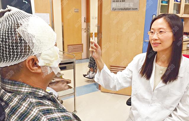 醫生為眼眶骨折病人檢查眼球轉動是否受到限制。