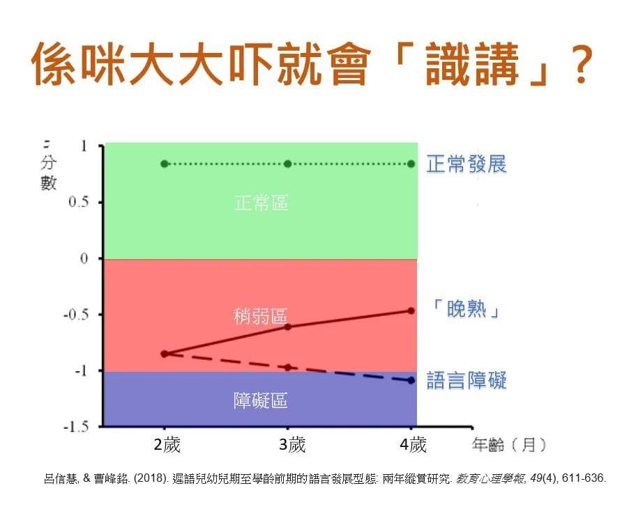 大家可能只係睇到佢「遲開口」,但唔了解係「大腦發展問題」或是「環境因素」影響。正如以下圖表,2歲只見到佢「比正常弱」,但唔知佢之後個走向(去到4歲)會點。返咗幼稚園之後,單純受「環境因素」缺乏說話機會及語言輸入嘅小朋友,就可以「追返少少」,家長就會見到「進步緊喎,好返啲喎」。
