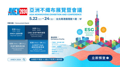 台北2024年5月15日 /美通社/ -- 由亞洲不織布協會(ANFA)與臺灣區不織布工業同業公會(TNFIA)共同主辦的「亞洲不織布展覽暨會議(ANEX 2024)」,將於5月22至24日假台北南港展覽館一館一樓首度登台展出。展覽吸引來自18個國家與地區逾300家廠商參與,展出規模達700個攤位。