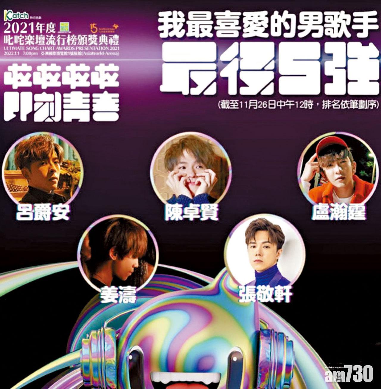 獎項花落誰家,要等到明年元旦夜才會知道,不過三張五強名單之中,其實也有很多值得留意的地方。男歌手五強分別是:張敬軒、姜濤、陳卓賢(Ian)、盧瀚霆(Anson Lo)和呂爵安(Edan);女歌手五強則包括:陳凱詠(Jace)、方皓玟、陳蕾、鄭欣宜和Serrini;而入圍組合五強的名字如下:C AllStar、Dear Jane、ERROR、MIRROR和MC $oHo & KidNey。翻看上屆資料,跟上述的十五個名字比對,發現今屆首度/再度入圍五強者,竟然多達九個,故毌須分析,仍可得出以下結論:說了多年的「香港樂壇改朝換代」,總算在2021年「禮成」。