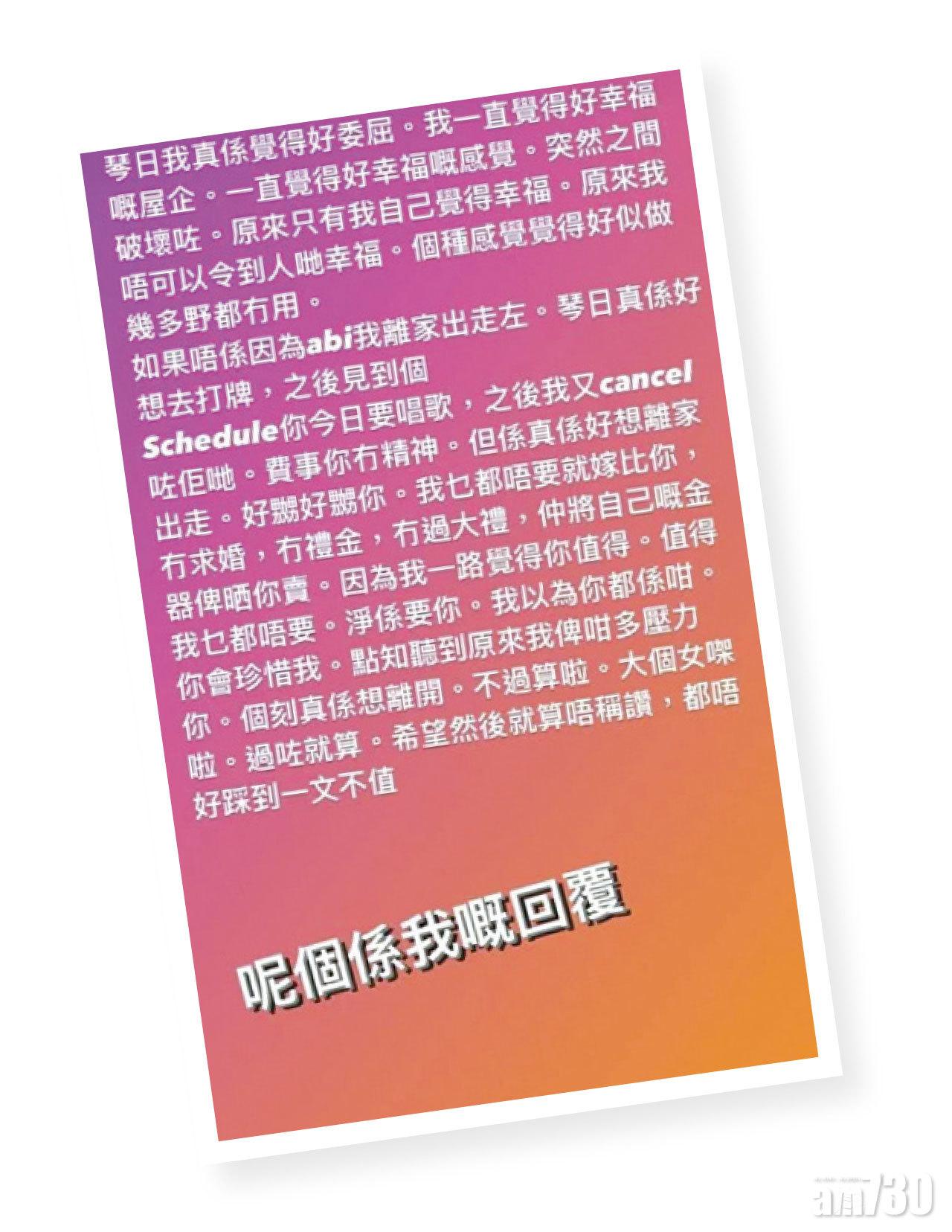 陳柏宇的太太符曉薇,在社交網絡出文怒罵丈夫。大意是丈夫接受訪問時,尖酸刻薄,讓人有種感覺在暗示太太不事生產,對家庭缺乏實質貢獻。符曉薇嬲到一個地步,在長文中表明自己好想離家出走。有網民話,將家事公諸於世?離婚㗎啦。