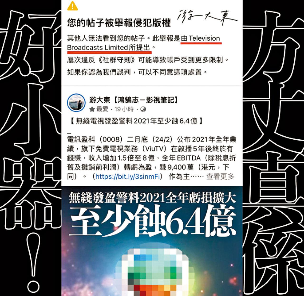 有留意本人社交平台(Facebook專頁、Instagram及MeWe)的讀者應該知道,每次撰寫報道或評論,文字以外,圖片更為重要,有時候為了製作一張相對「似樣」、「靚仔」而且能夠講出重點的圖像,動輒花上一兩個小時。而「電視廣播發盈警」這種題材,根本就是財經新聞,故理所當然以最直接的方式,使用無綫台徽來製圖(截圖自2012年的台徽片段),內容亦完全按照他們對外發布的公告來撰寫,沒有添加任何個人分析臆測。殊不知周六(12/3)發文,翌日(13/3)一覺醒來打開手機的Facebook應用程式便見到「您的帖子被舉報侵犯版權」的提示,而舉報者正是Television Broadcasts Limited,即「電視廣播有限公司」的英文全名。
