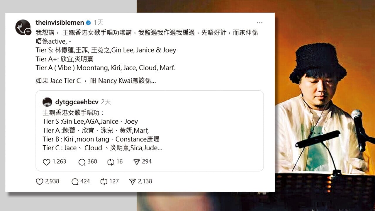 更吊詭的是,Alex本身是製作人,他不是純粹路過留言區的網民。當網民排tier,你可以話係情緒發洩、口水戰;但當一個圈中人以這樣方式落場,事情就不是只是一場玩笑,而是一場判決。他隨手畫的一條線,更容易比「難聽歌手俱樂部」的尖酸刻薄成為標準。