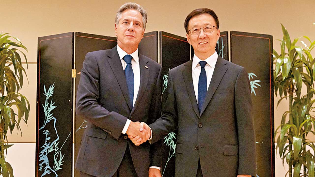 國家副主席韓正(右)早前會見美國國務卿布林肯。