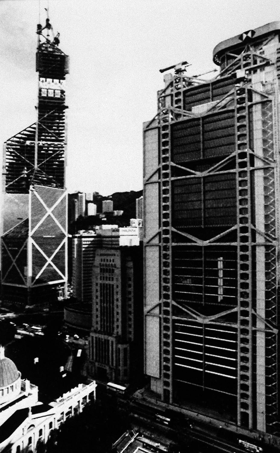 1988年,興建中的中銀大廈與新落成的滙豐大樓。(圖片來源:AP)
