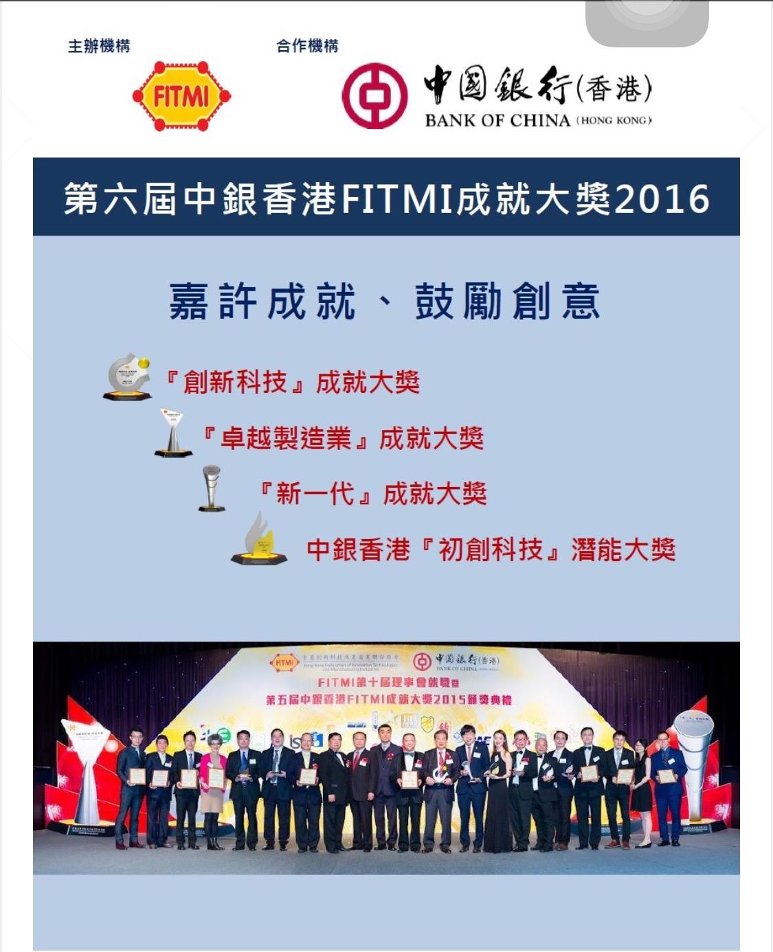 香港創新科技及製造業聯合總會(FITMI)於2011年成立FITMI成就大獎,獎項包括「創新科技」、「卓越製造業」和「新一代」,經過數屆的舉辦,共選岀了四十多位業界精英,表障他們在行業的成就,歷屆盛事,也越來越榮幸獲得業界翹楚的廣泛認同,大家爭相報名參賽,已成為每年一度的頒獎盛事!