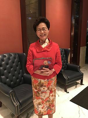 新一任行政長官林鄭月娥出席回歸20周年煙花匯演活動時,用上愛連心製作的手提袋。(相片由愛連心提供)