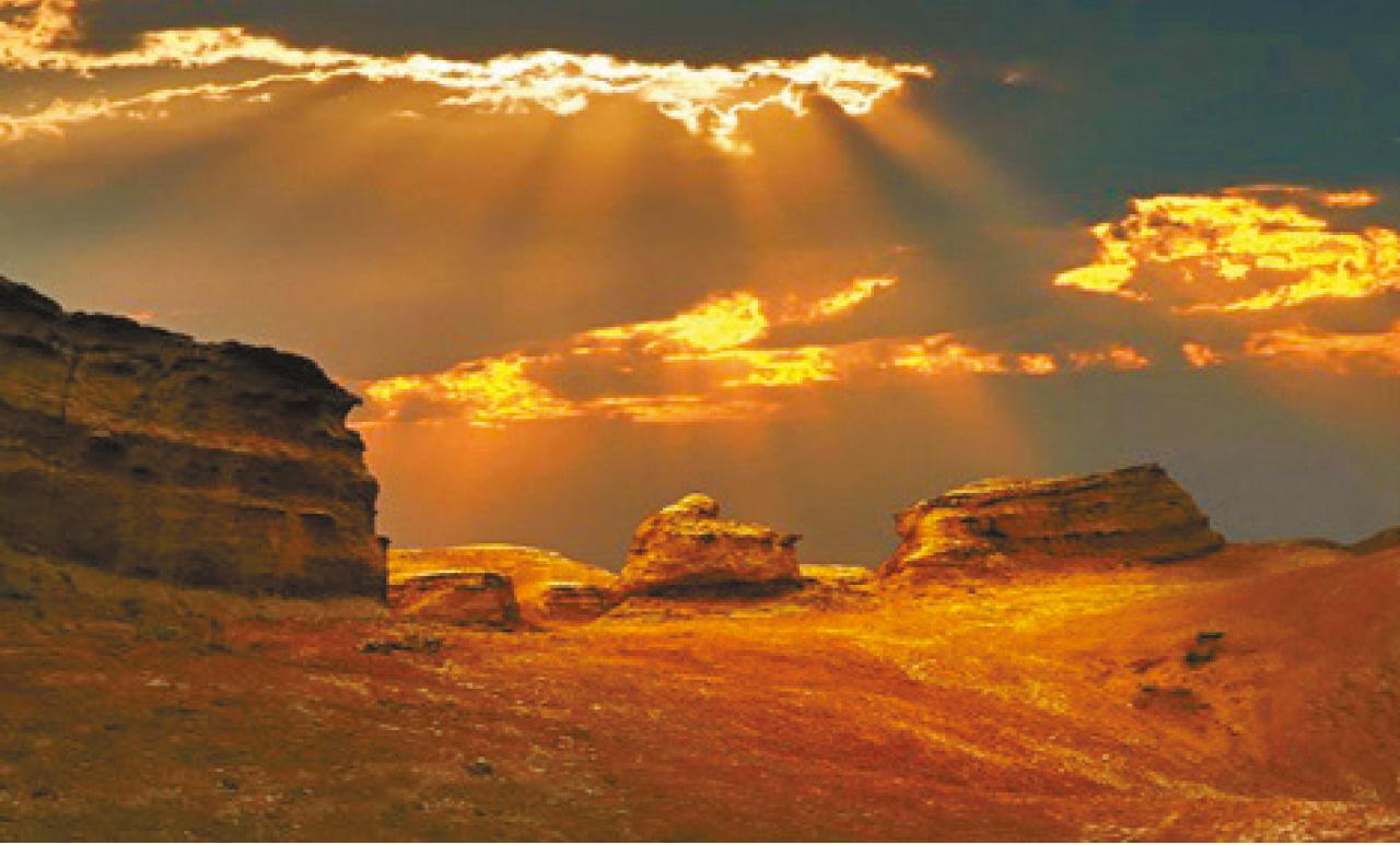 離喀納斯約4小時車程的布林津五彩灣,因河流衝擊以及狂風侵蝕,形成雅丹地貌,北岸幻化異彩的礦物質岩石,與一河相隔的南岸綠樹成林呈有趣的強烈對比。烏爾禾又稱為魔鬼城,因四季多風,風聲激蕩迴旋,淒厲呼嘯,如同鬼哭。據說一億多年前,此處原是淡水湖,經過地殼變動及千百萬年的風雨剝蝕,形成溝壑石層,被狂風雕琢得奇形怪狀,山坡佈滿血紅、湛藍和橙黃的石子,宛如魔女遺珠,更增添幾分神秘色彩。
