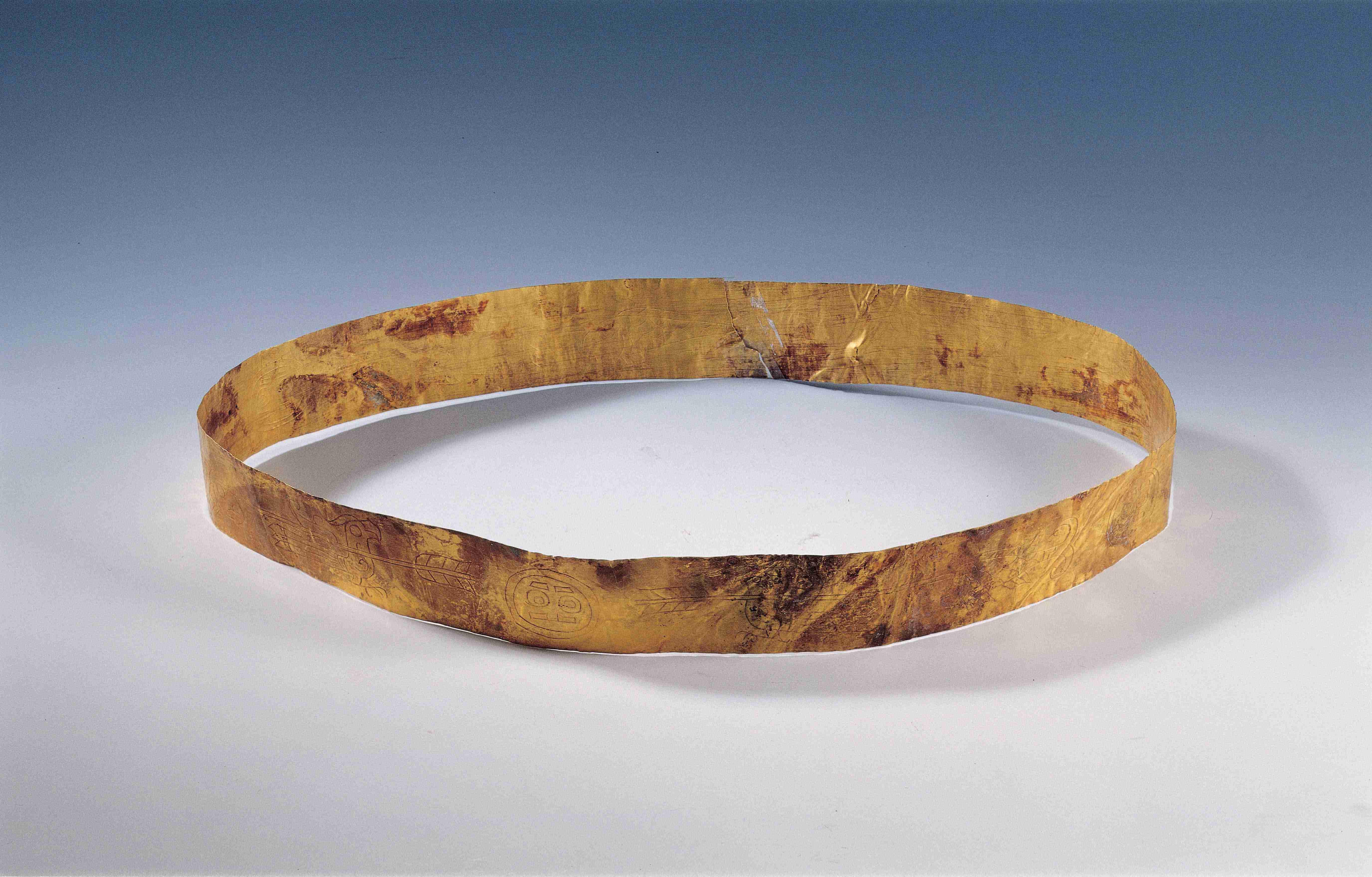 鏨刻魚、箭、鳥和人面圖案的「人面魚鳥箭紋金冠帶」,是古蜀國王權與神權的象徵。