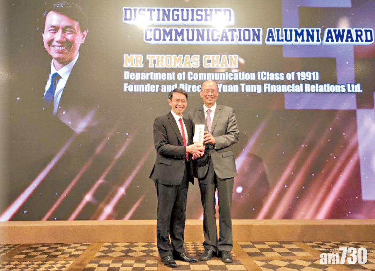 金管局前傳訊總監、現為圓通公關顧問公司創辦人及董事陳民傑(Thomas),上周獲頒浸會大學傳理學院「傑出傳理人獎」,以表彰其於專業內的突出表現及貢獻,並於50周年院慶晚宴上頒發獎項,由院長黃煜手上接過獎項。Thomas兄同Ray講笑話因為年紀夠大先至僥倖獲獎,實在太謙,查實佢由財經記者出身,繼而縱橫公關傳訊業多年,經驗及判斷都有過人之處,又肯提拔後進,Ray都要多多學習,金管局前總裁任志剛都讚佢處事認真,現在得此嘉許實至名歸,再次在此恭喜!
