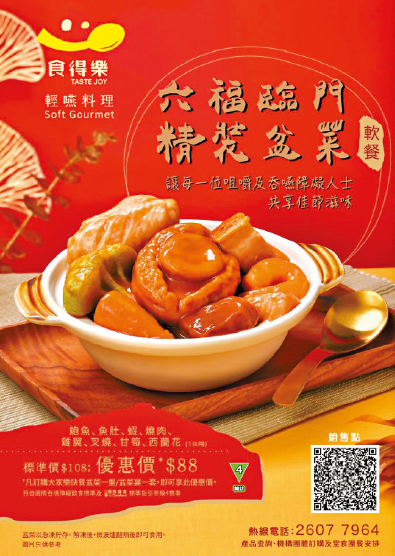 不少家庭都喜歡食盆菜賀年!為了照顧吞嚥障礙人士的口味,大家樂集團有限公司旗下品牌「食得樂」輕嚥料理最新推出「六福臨門」精裝盆菜,選用鮑魚等6款主要食材,包含鮑魚、魚肚、蝦、燒肉、雞翼、叉燒等,配搭甘筍及西蘭花,全部以真實食材製成,符合「國際吞嚥障礙飲食標準」(IDDSI)及「照護食標準指引」等級4標準,還原食物的原味,賣相精美,讓咀嚼及吞嚥障礙人士也能與家人共享佳節滋味。
