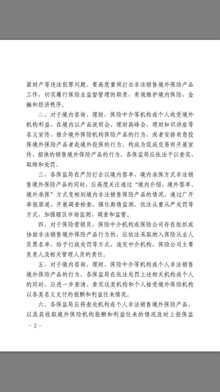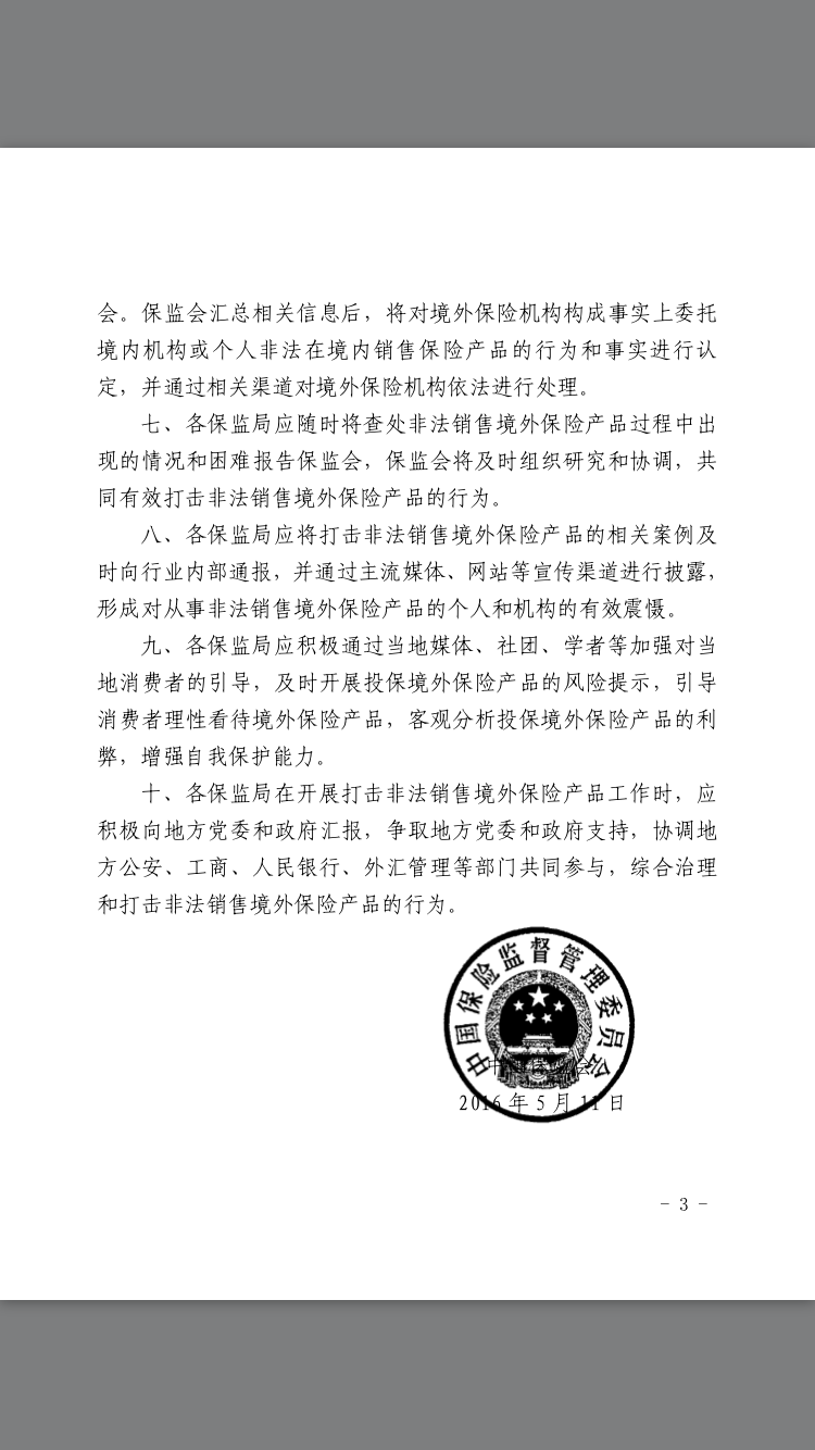 全國各地的保監局全面開展「打擊非法銷售」境外保險產品,協調各地方公安、工商、人民銀行、外匯管理等部門共同參與,整體治理和打擊在國內進行的一切非法銷售境外保險產品的行為。