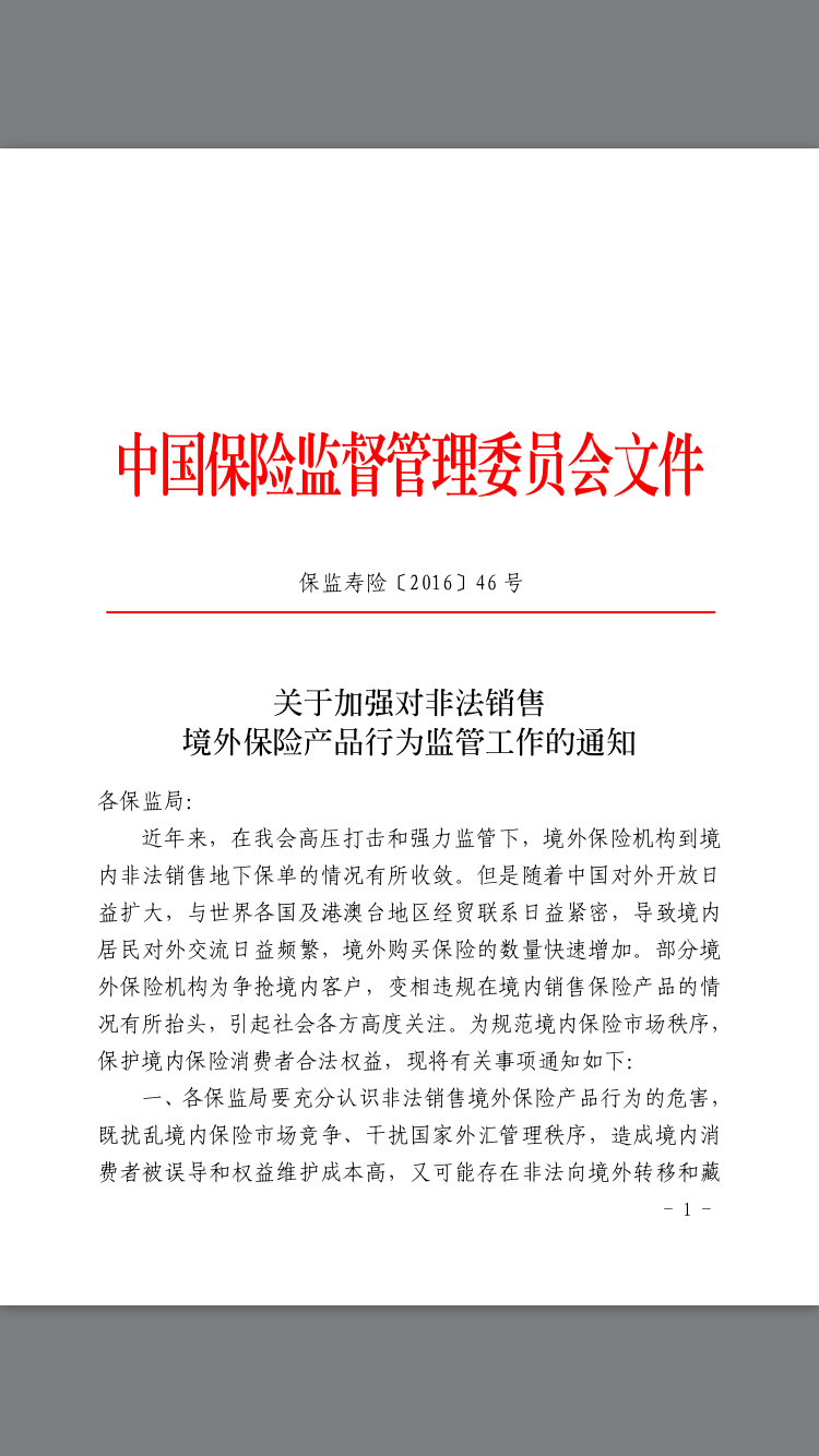 近日大陸網上流傳「中國保險監督管理委員會」在2016年5月11日發出正式文件(堅嘢),打擊非法銷售境外保險產品,要求行業內部及時通報,通過主流媒體、網站進行披露,對從事「非法銷售」的個人及機構進行「有效震懾」。