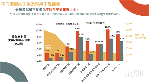 然而,今次疫情所衍生失業問題的特徵與以往不同,根據社聯的研究,今次影響範圍很廣,除了基層人士外,即使從事較高收入的行業,擁有較高學歷的人士,在疫情下同樣面對失業或就業不足,失業期中位數近三個半月。現時就有超過三成失業及就業不足的家庭陷入貧窮情況。然而,好些失業人士只要給予短期支援,或可捱到重新就業,但以現時綜援的申請資格,他們實在難以受惠,亦不用說綜援的負面標籤可能令人卻步。