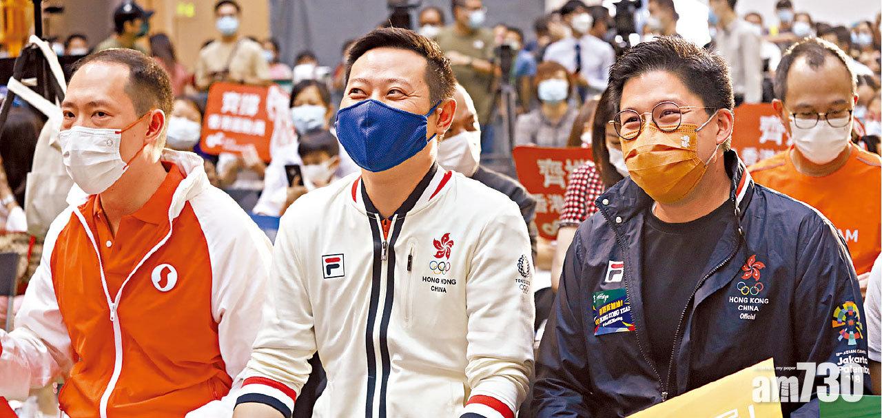 霍啟剛(右)與徐英偉到奧海城觀看直播,為香港運動員打氣。