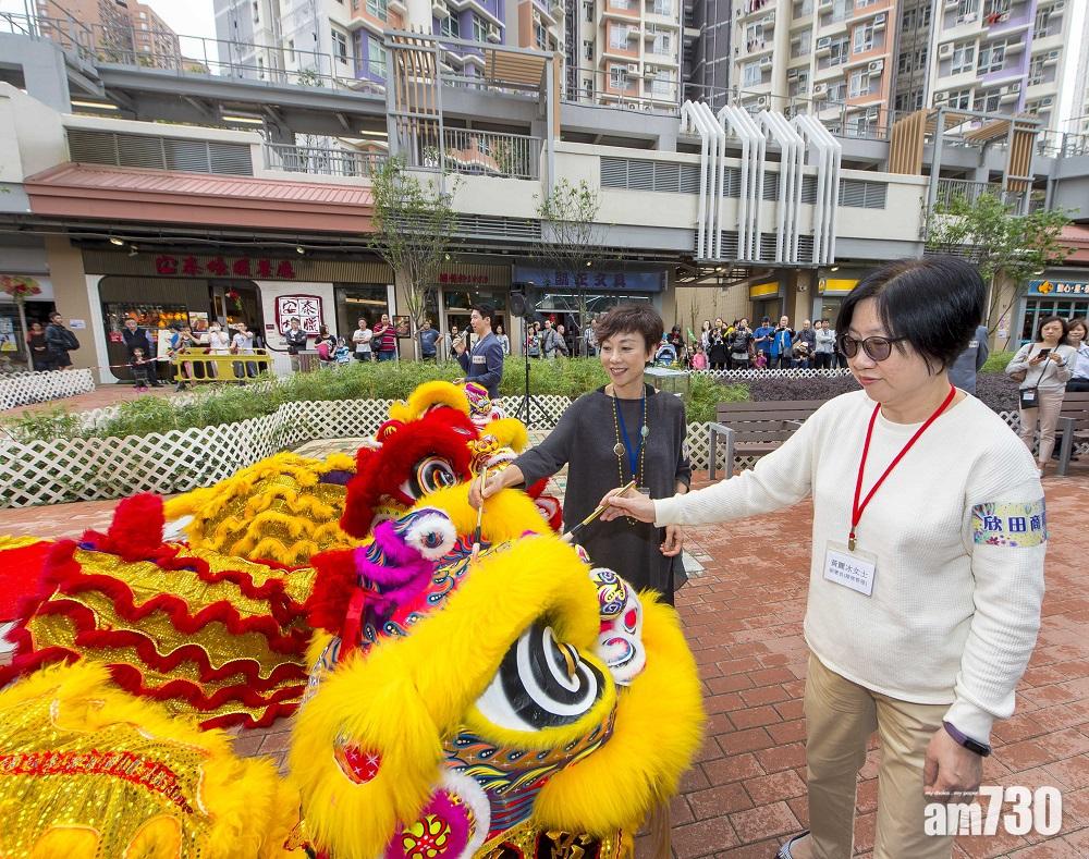 香港房屋委員會(房委會)轄下商業樓宇小組委員會主席許美嫦(左)及和房屋署副署長黃麗冰(右)到欣田商場主持開幕禮並為醒獅點睛。