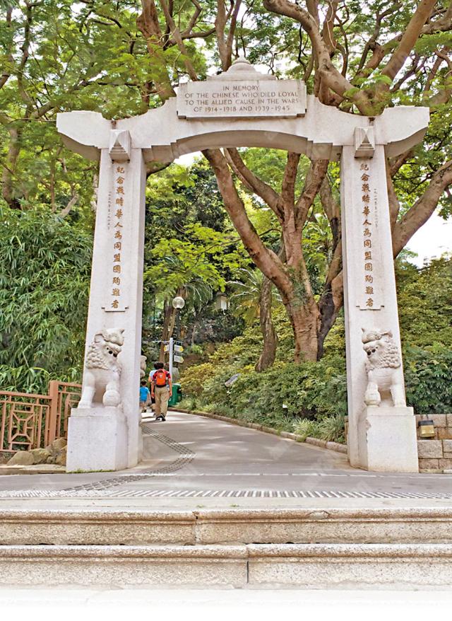 在中環心臟地帶背後有一個寧靜的動植物公園,憩靜的公園遠離中環的繁華,但行走公園內,涼風吹起卻有一陣的入骨寒意。由正門離開回望拱門,拱門的外形與西式公園的設計顯得分外格格不入。拱門一左一右刻著「紀念戰時華人為同盟國殉難者,一九一四年─一九一八年‧ 一九三九年─一九四五年」,形狀彷彿有些像神社的鳥居。